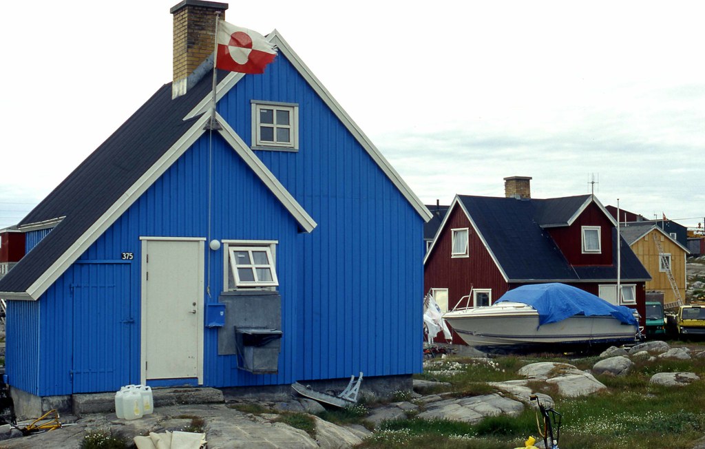 Sometimes I walk around the town, around Qasigiannguit. The houses are all painted in bright colours (and all in different bright colours – that’s the best thing). White window frames and steep pitched roofs. They’re prefabs, I think. Shipped in here from somewhere else. Built for bad weather. The town smells of salt and fish and engine-oil. Ice floes bob in the bay. On blue days there’s so much sky you can’t believe it.